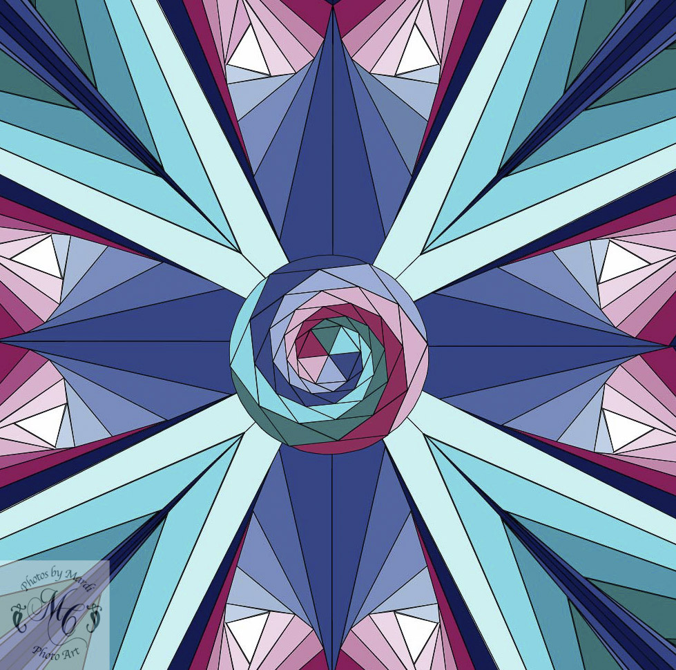 I was not giving up on this quilt! I went to my computer to play with ideas, and decided to try covering the center with a four-point star offset from the one already there, then appliqué my spiral into the center of it before appliquéing the whole thing to the quilt. Ultimately, I will cut away as much of the over-seamed area underneath as possible.